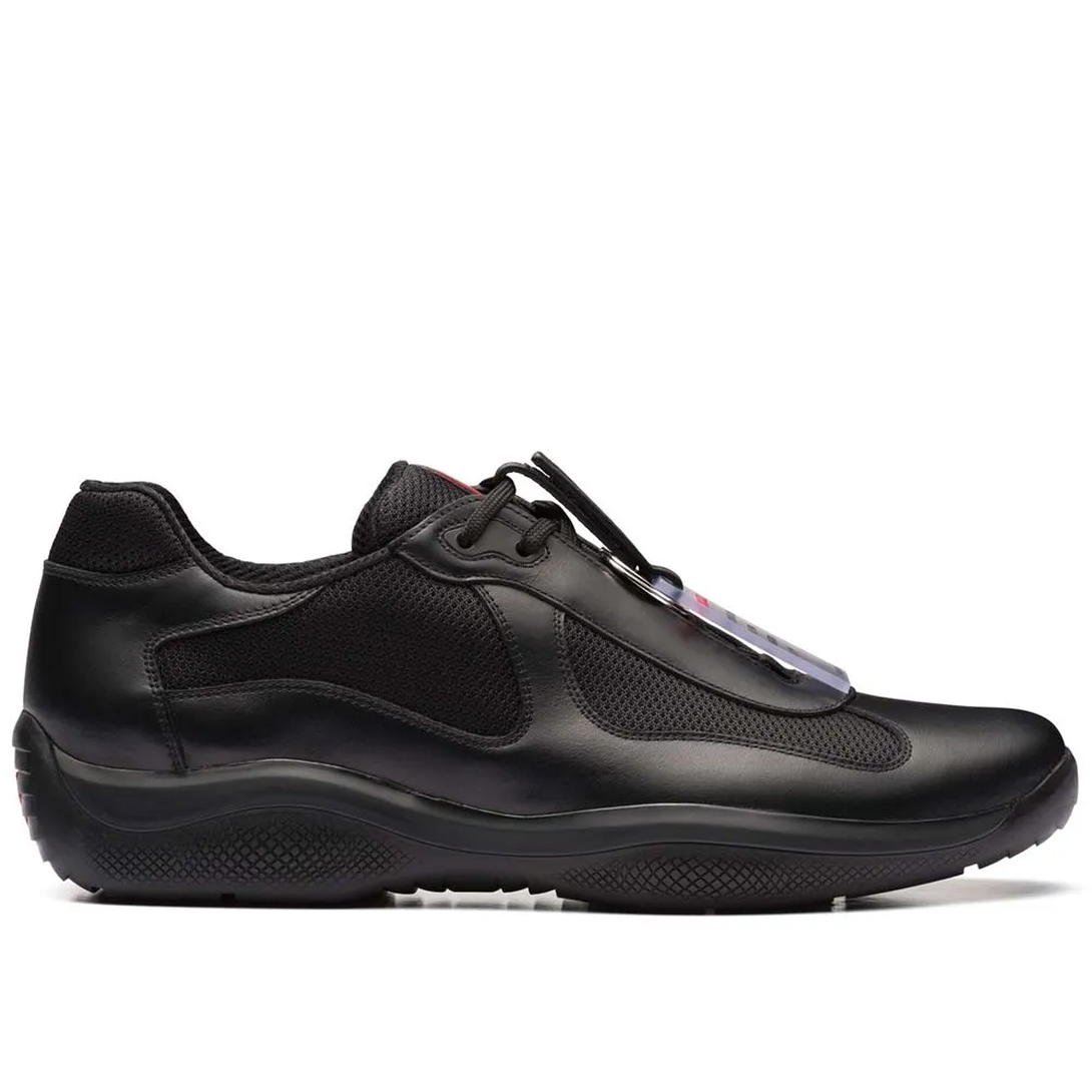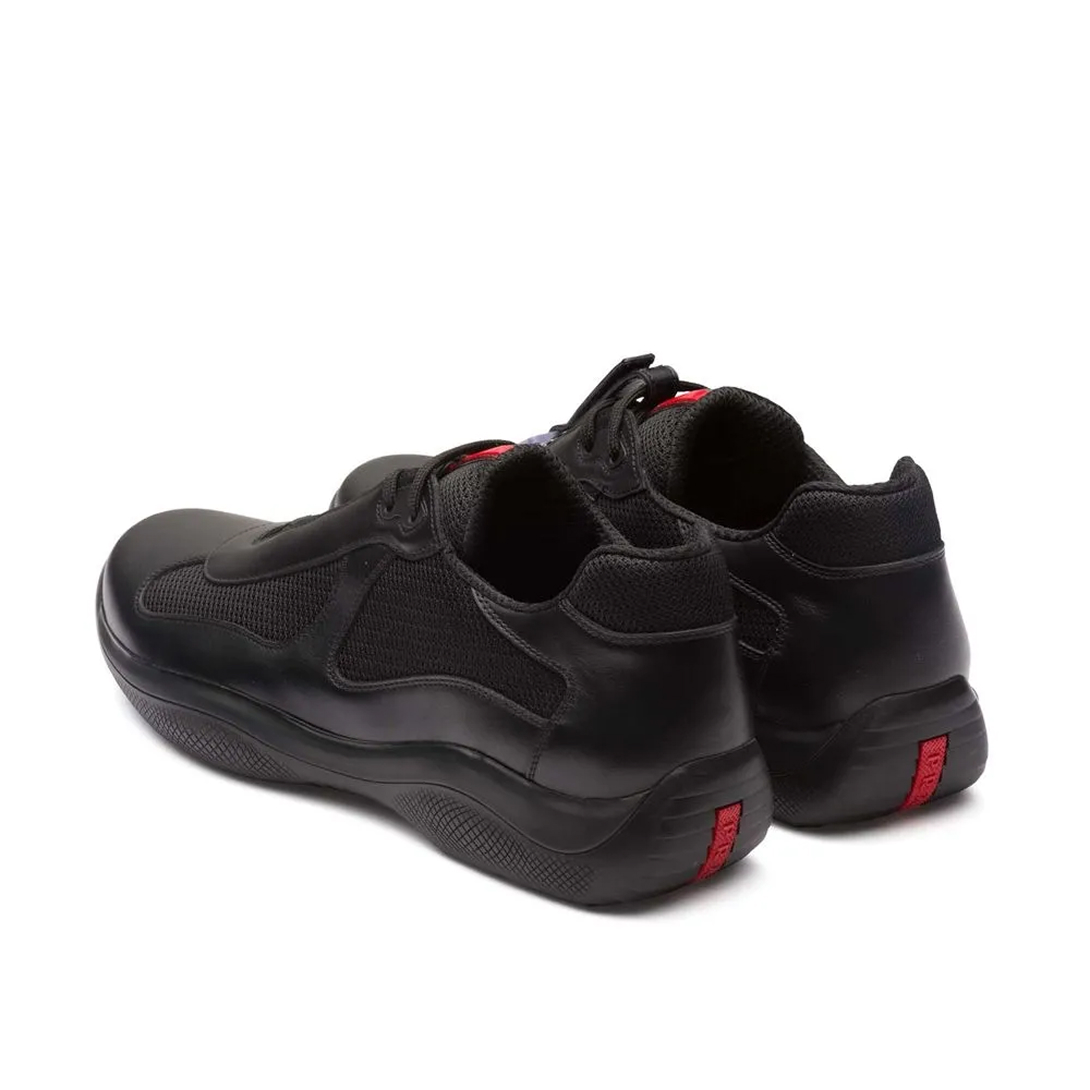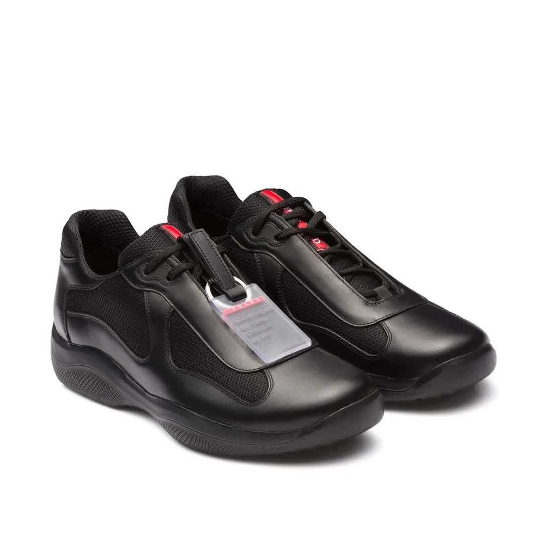O modelo America’s Cup é um clássico da Prada que une performance e sofisticação. Confeccionado em couro de bezerro com painéis em tela técnica, o tênis apresenta design esportivo refinado, com recortes marcantes e solado flat em borracha. Ideal para composições casuais com um toque luxuoso.