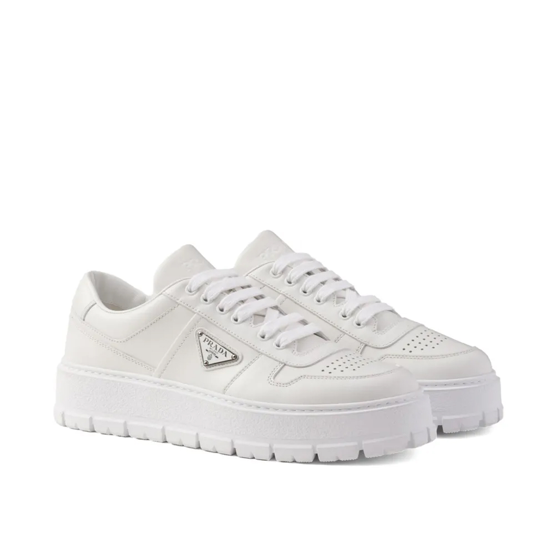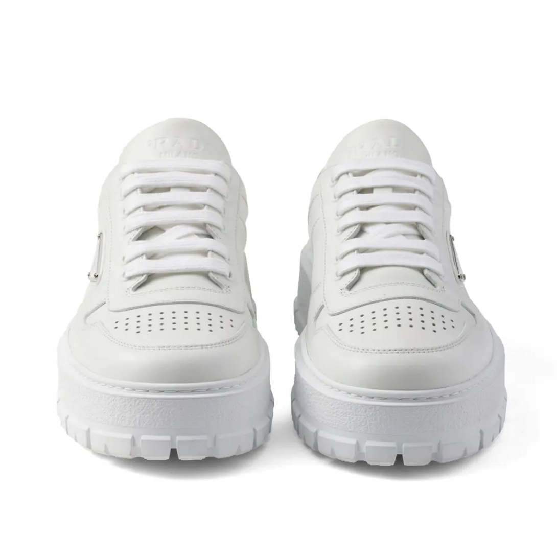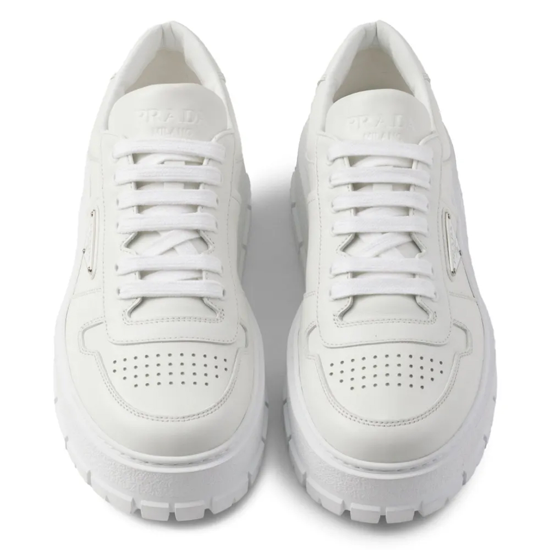 Este modelo clássico da Prada traduz a essência do design italiano com linhas limpas e detalhes icônicos. Confeccionado inteiramente em couro branco, o tênis apresenta perfurações sutis, o inconfundível logo triangular esmaltado e solado tratorado que une estilo e funcionalidade.