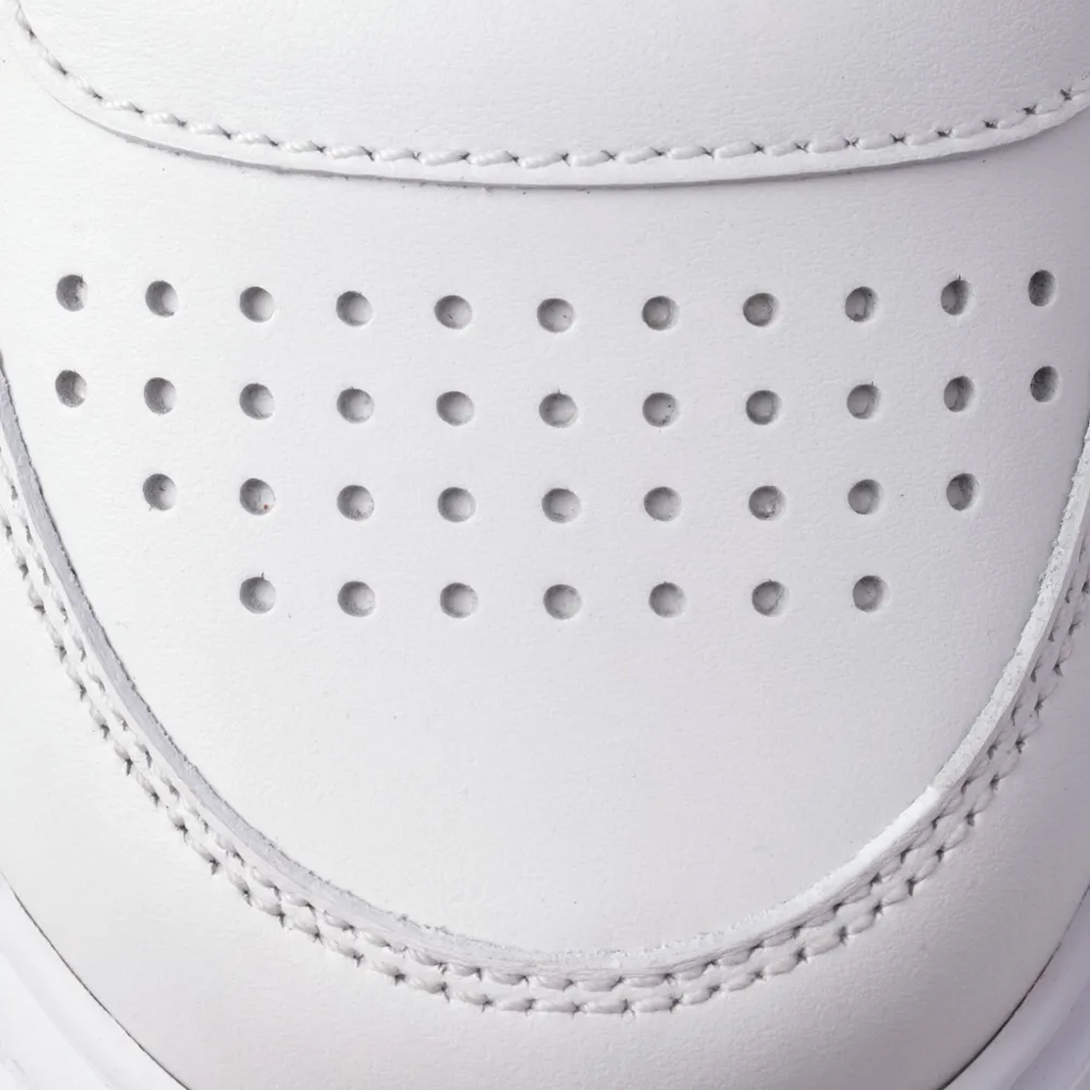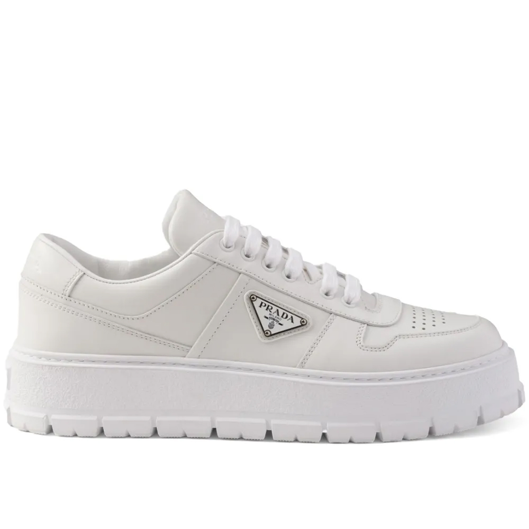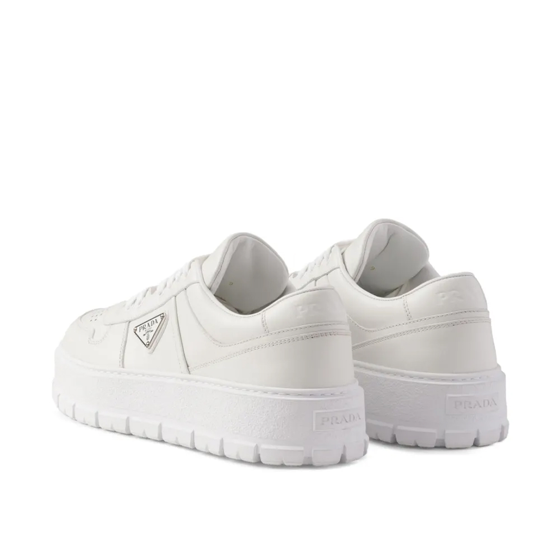 Este modelo clássico da Prada traduz a essência do design italiano com linhas limpas e detalhes icônicos. Confeccionado inteiramente em couro branco, o tênis apresenta perfurações sutis, o inconfundível logo triangular esmaltado e solado tratorado que une estilo e funcionalidade.