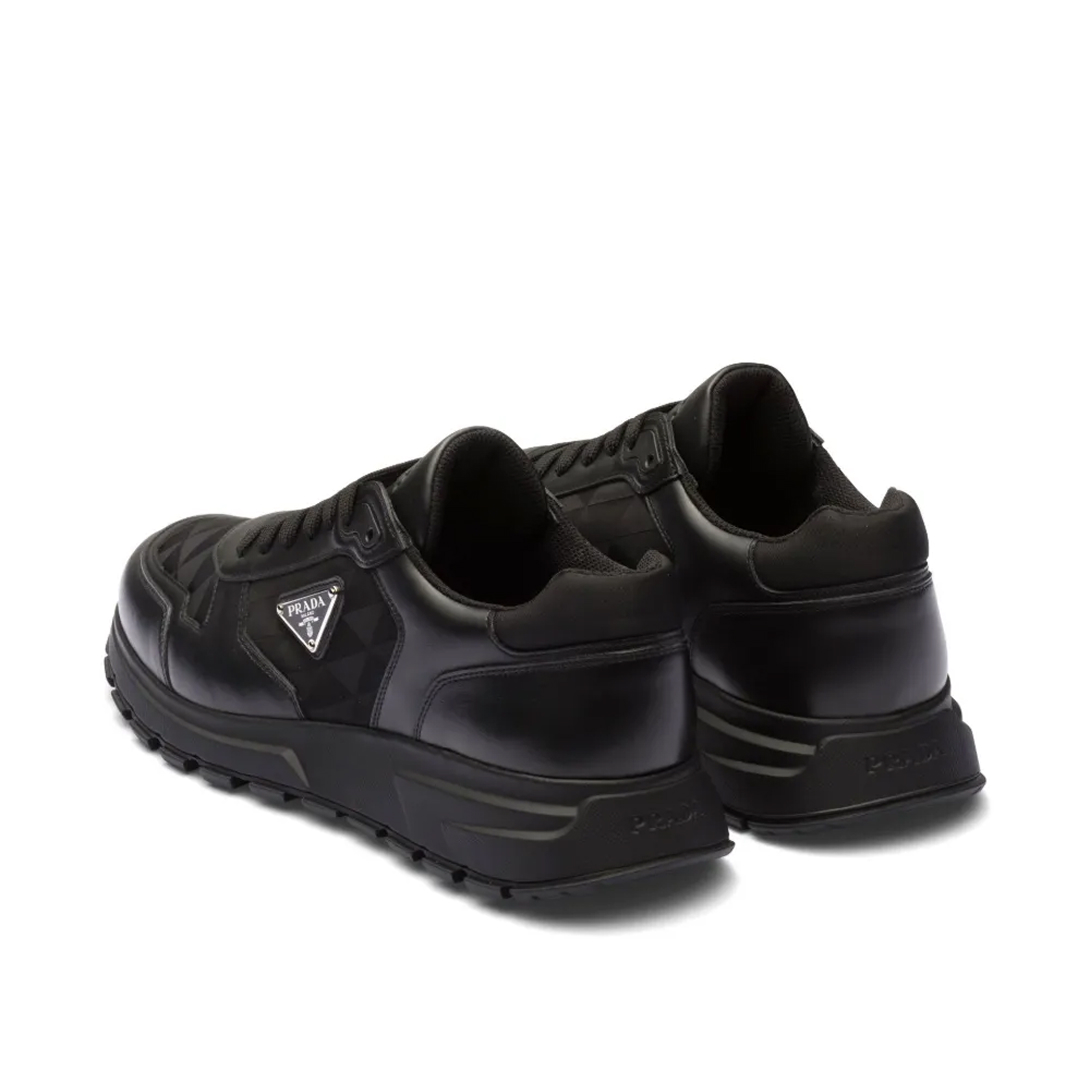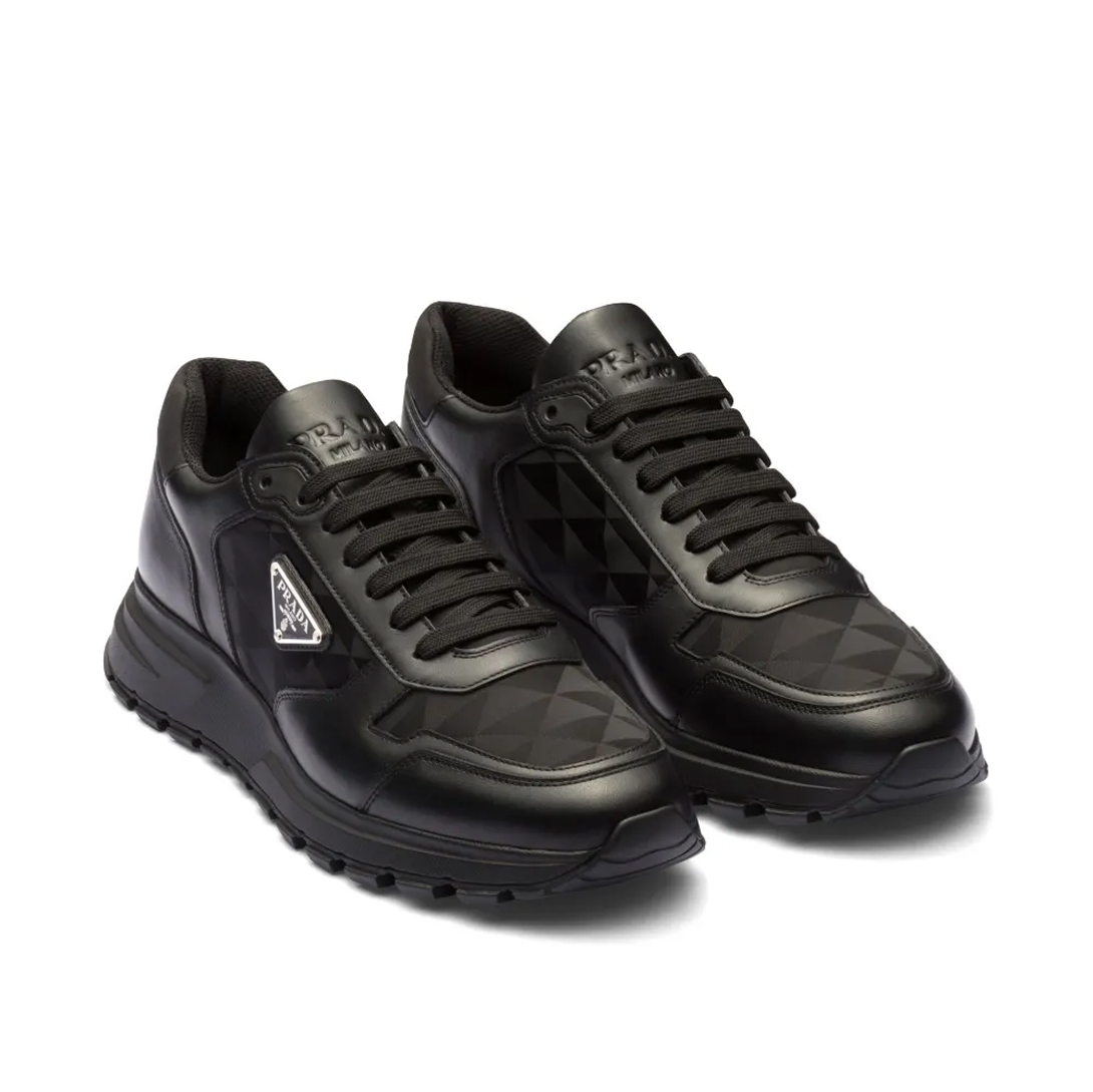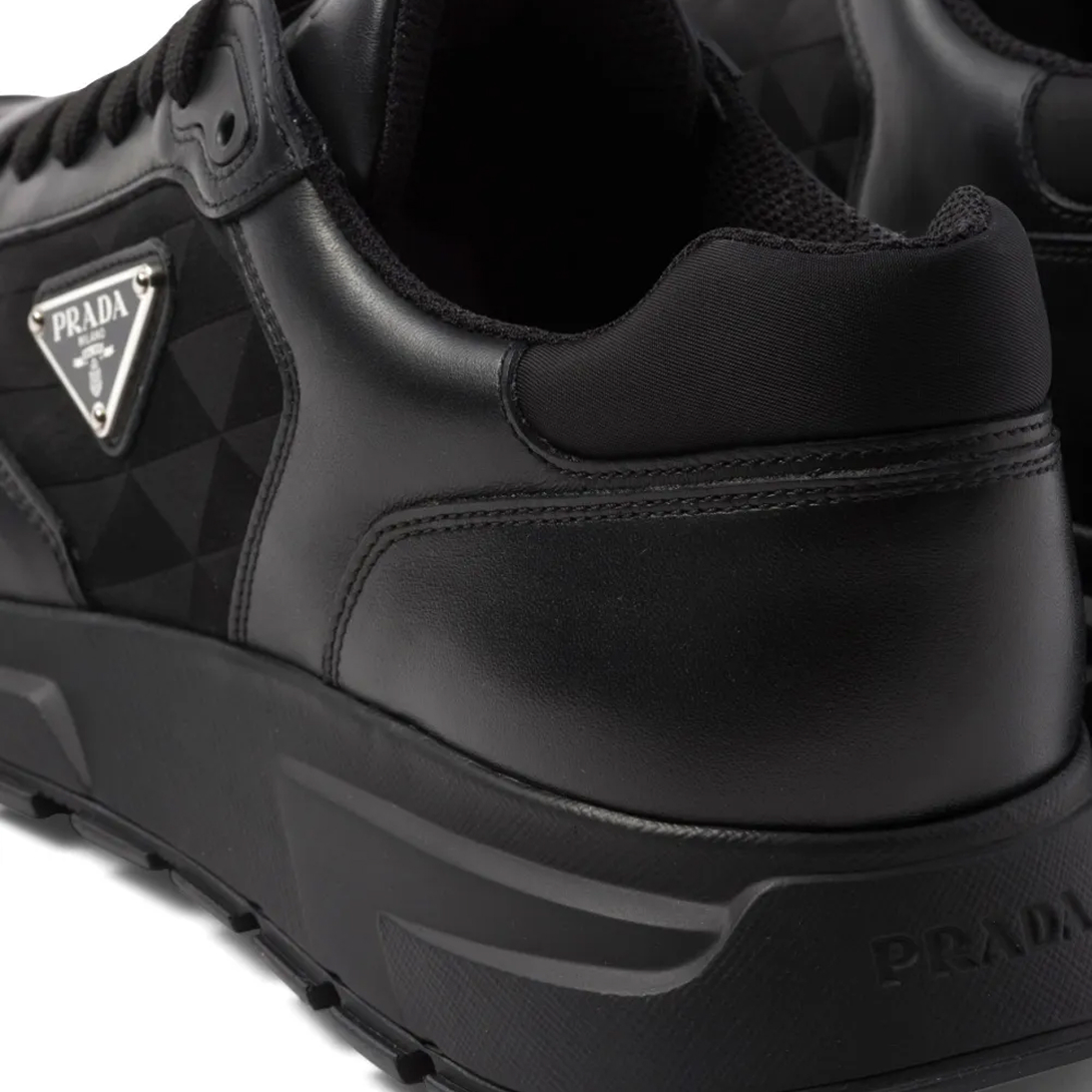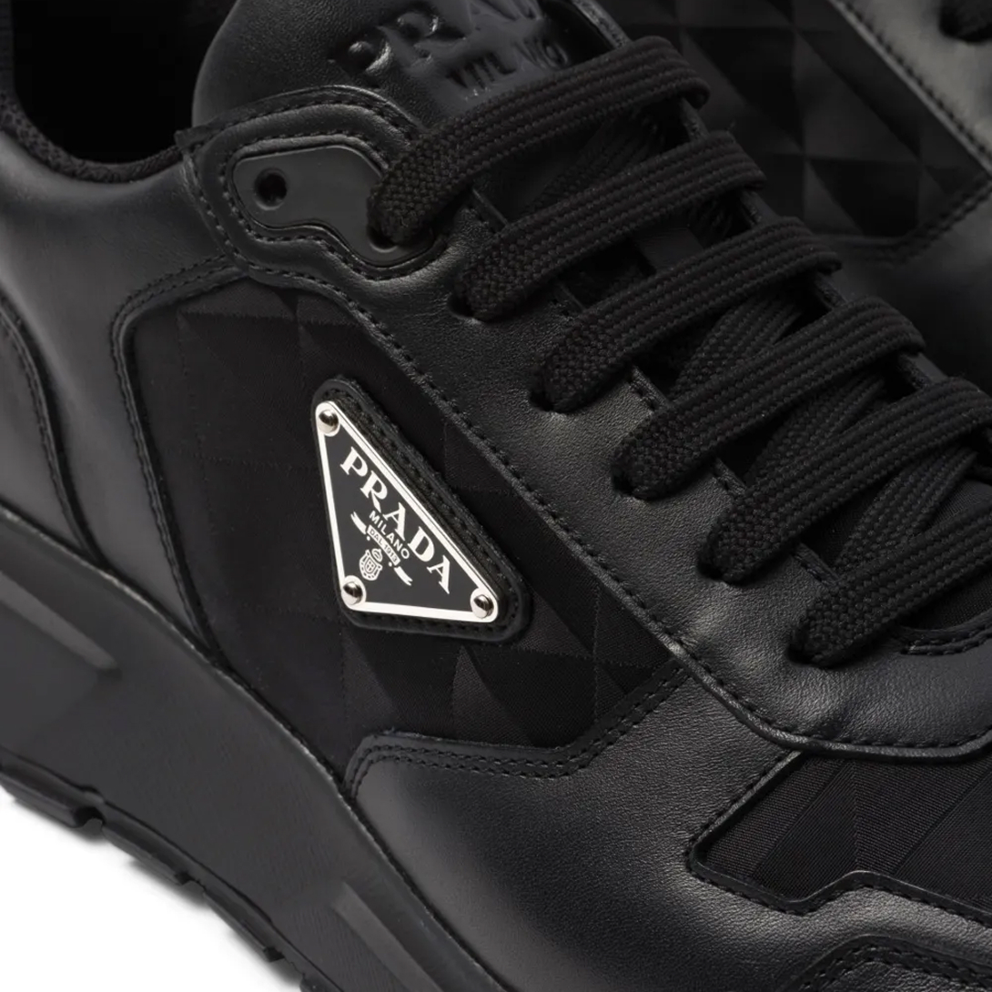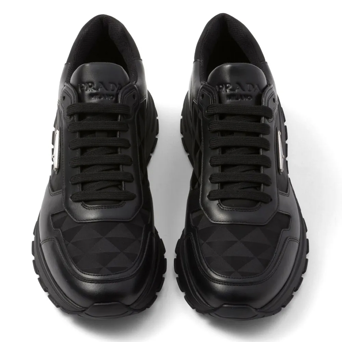 Com visual refinado e toque esportivo, este tênis Prada combina couro preto com lona texturizada em logo jacquard. O design é complementado pelo icônico logo triangular, assinatura na lingueta e palmilha personalizada. Ideal para looks urbanos com sofisticação e atitude.