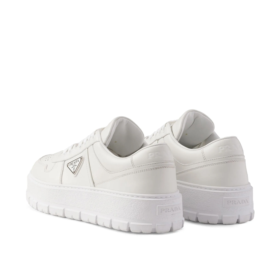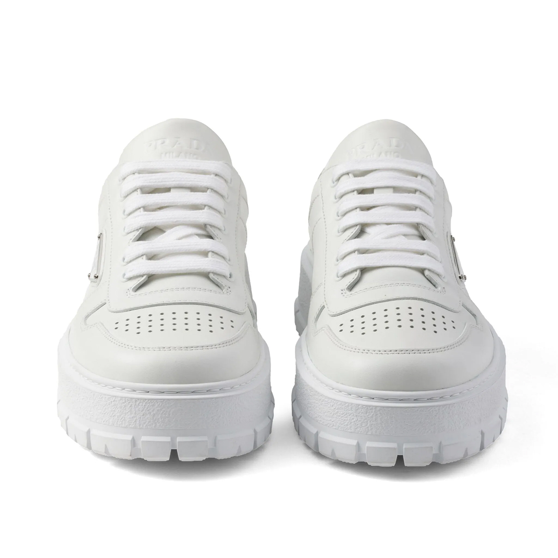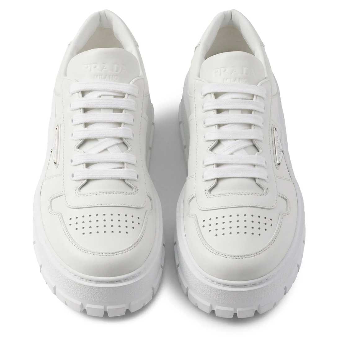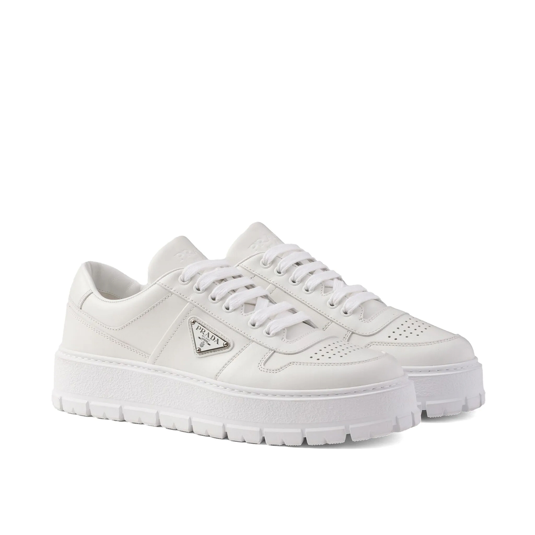 O tênis de couro da Prada é a combinação perfeita entre design minimalista e identidade marcante. Confeccionado inteiramente em couro branco, o modelo apresenta perfurações discretas, o icônico logo triangular esmaltado na lateral, além de assinaturas da marca na lingueta e no calcanhar. Seu solado tratorado de borracha garante estilo contemporâneo com aderência e conforto em cada passo.